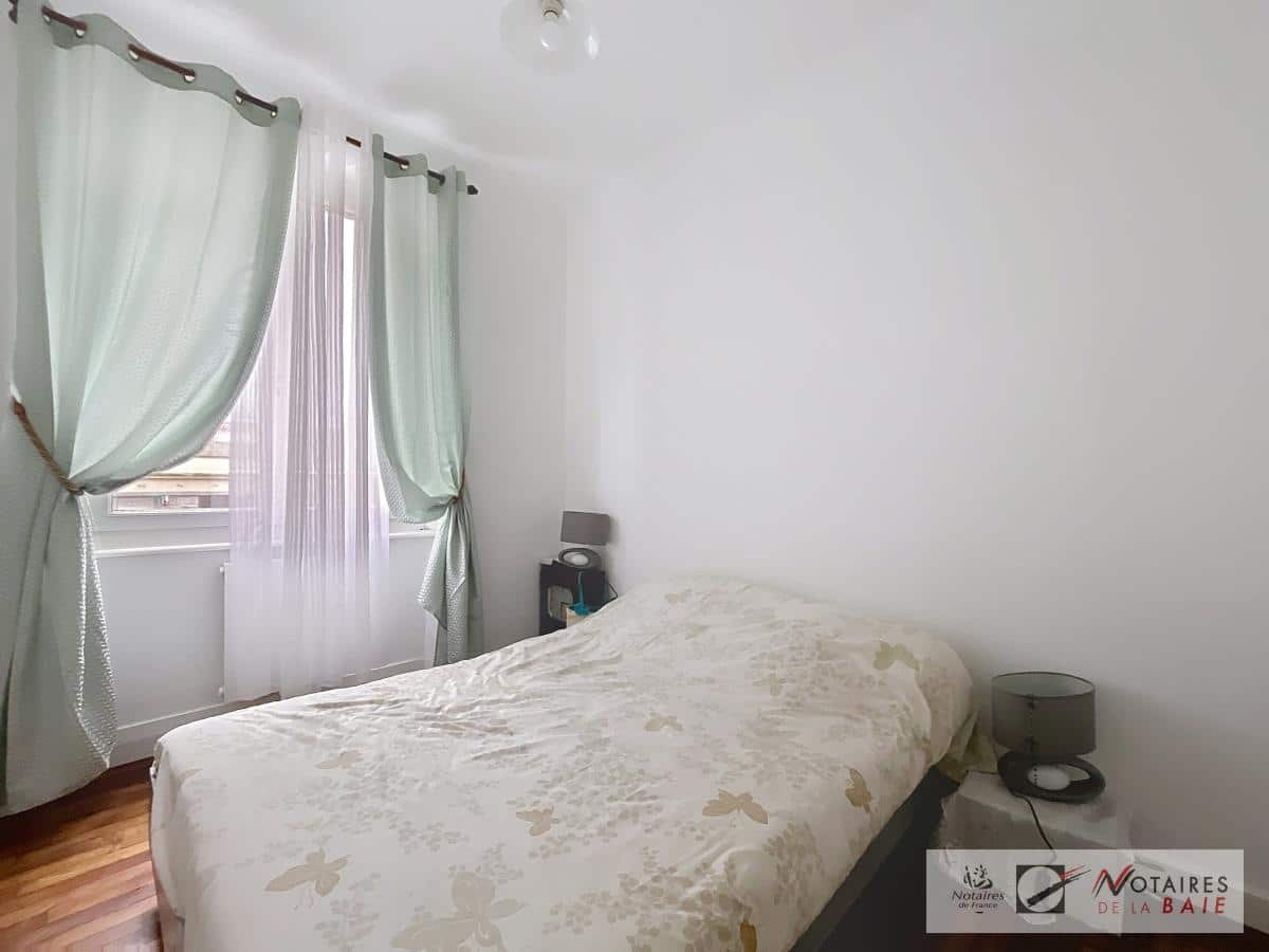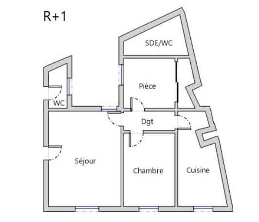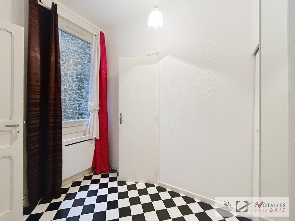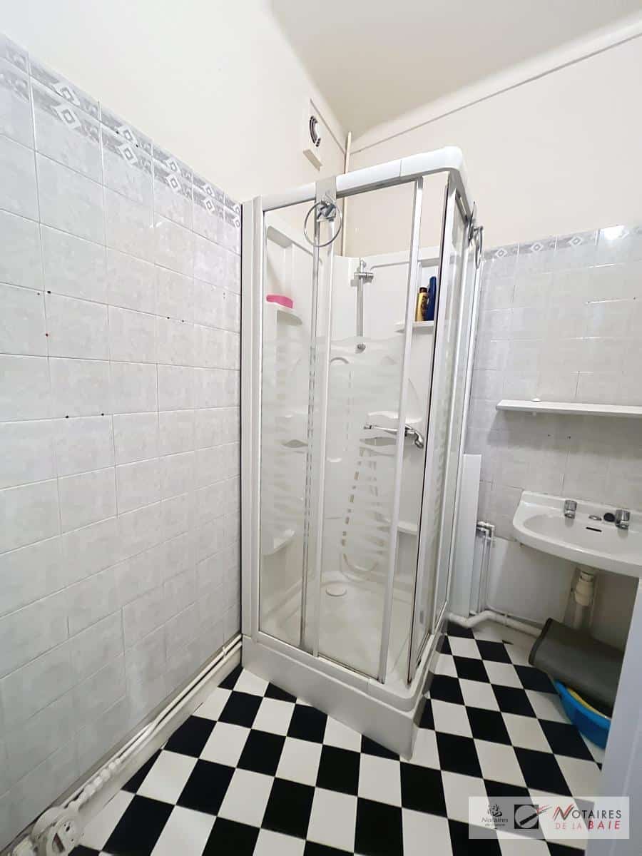 Au premier étage, un appartement comprenant une pièce de séjour, une cuisine, une chambre, un espace bureau, salle d'eau avec w.c. Une cave et la moitié indivise d'un ancien w.c. à mi-étage.
